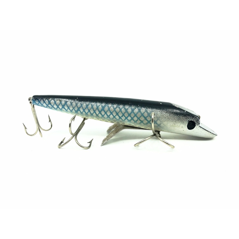 Alzbaits Al Tumas FinFish Bait, Shad Scale Color. About 7 1/2″ long body. Vintage lure in great condition with only some minor. Made and signed by the late Al Tumas of Appleton and Minocqua, Wisconsin. Famous local musky guide and lure maker.