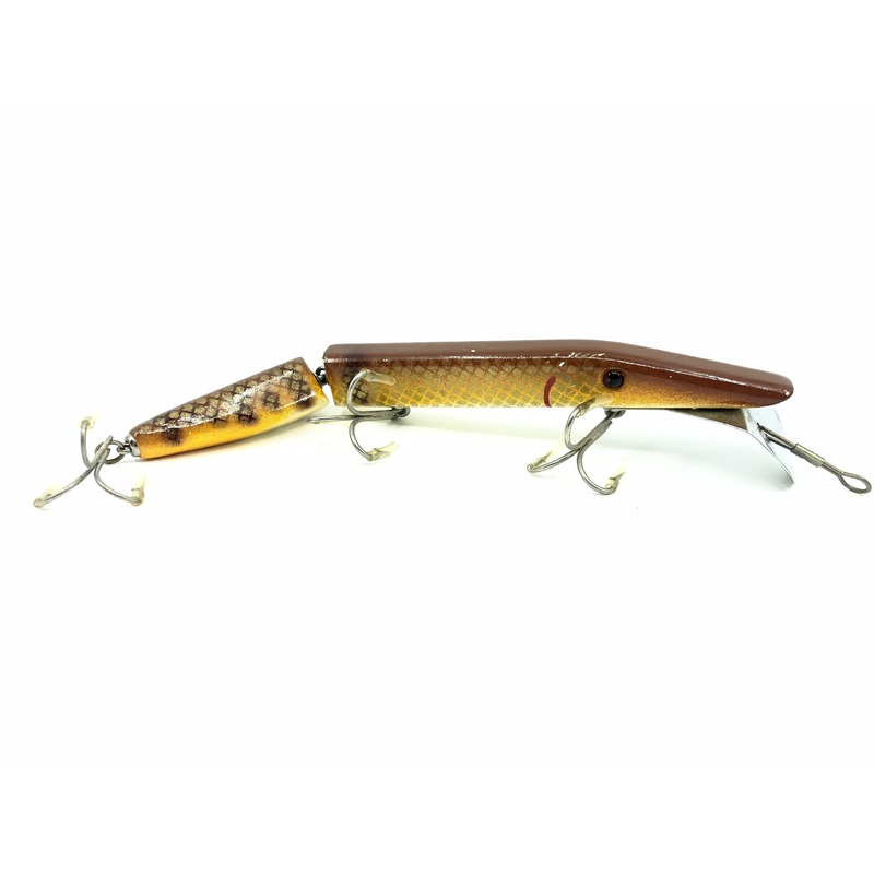 Alzbaits Al Tumas Friendly Al Jointed Musky Lure Jointed, Brown/Yellow Scale Finish Color. Made by the late Al Tumas of Appleton and Minocqua, Wisconsin. Famous local musky guide and lure maker.