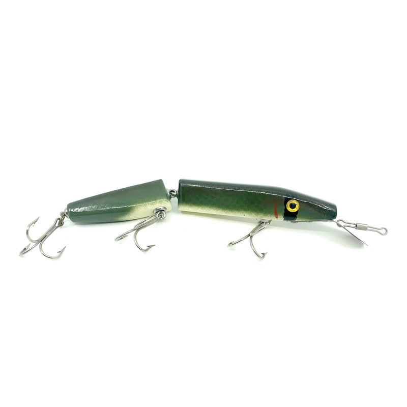 Alzbaits Al Tumas Friendly Al Jointed Musky Lure Jointed, Green Shad Color. Made by the late Al Tumas of Appleton and Minocqua, Wisconsin. Famous local musky guide and lure maker. Lure is in great shape.
