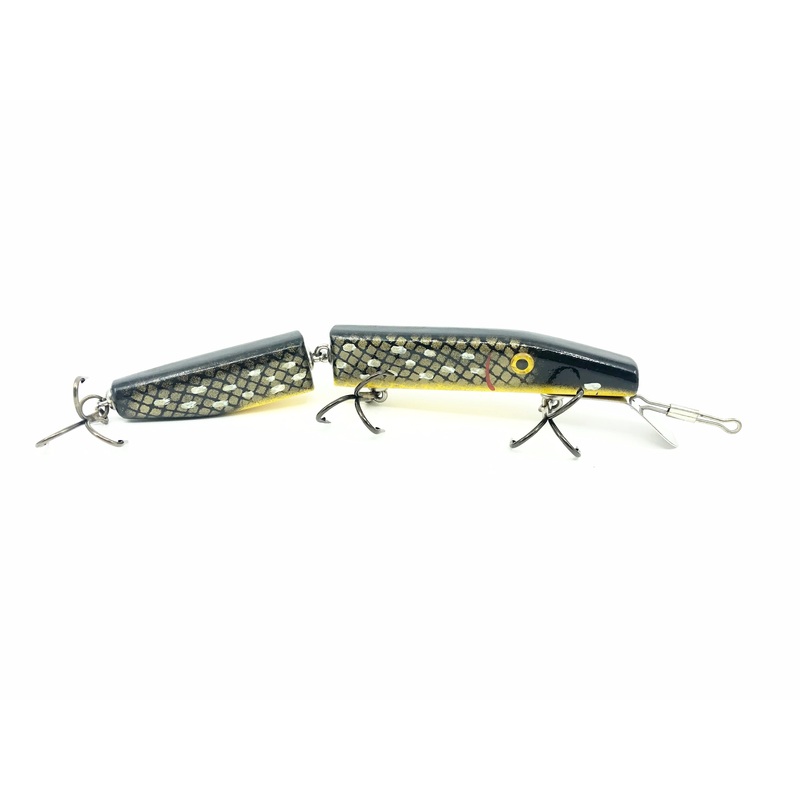 Alzbaits Al Tumas Jointed Pikie Musky Lure, Black Pike Color. Made by the late Al Tumas of Appleton and Minocqua, Wisconsin. Famous local musky guide and lure maker.