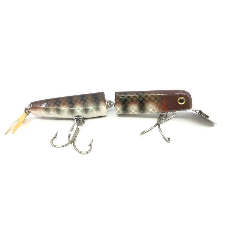Alzbaits Jointed Pikie Metal Tail Musky Lure Brown Pike Scale Finish. About 6 1/2″ long body not including lip. Vintage lure but appears unused and in great condition.Made by the late Al Tumas of Appleton and Minocqua, Wisconsin. Famous local musky guide and lure maker.