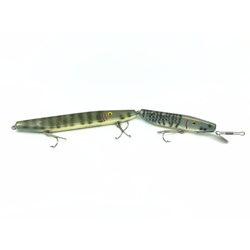 Alzbaits Musky Chaser Jointed Musky Lure Pike and Scale Finish Color SIGNED!About 14 1/4″ long body not including lip. Vintage lure but appears unused and in great condition. Made by the late Al Tumas of Appleton and Minocqua, Wisconsin. Famous local musky guide and lure maker. Signed by Al himself.