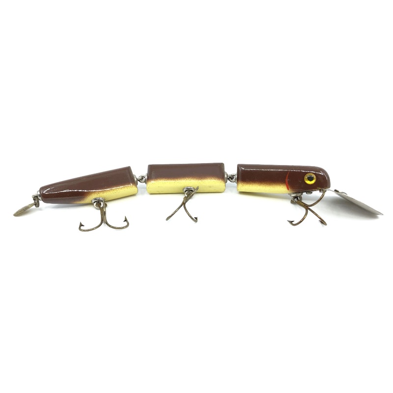 Alzbaits Triple Jointed Pikie Metal Tail Musky Lure Brown Pike Color.Almost 10" long body not including lip. Vintage lure but appears unused and in great condition.Made by the late Al Tumas of Appleton and Minocqua, Wisconsin. Famous local musky guide and