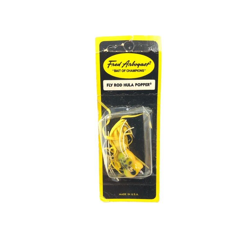 Arbogast Fly Rod Hula Popper Frog Color New on Card Old Stock. Great vintage bait here. Body of lure about 3/4" long. Card in ok shape, bubble has some damage and is separating a little from card. Lure new on card with expected drying of tail. Classic Arbo