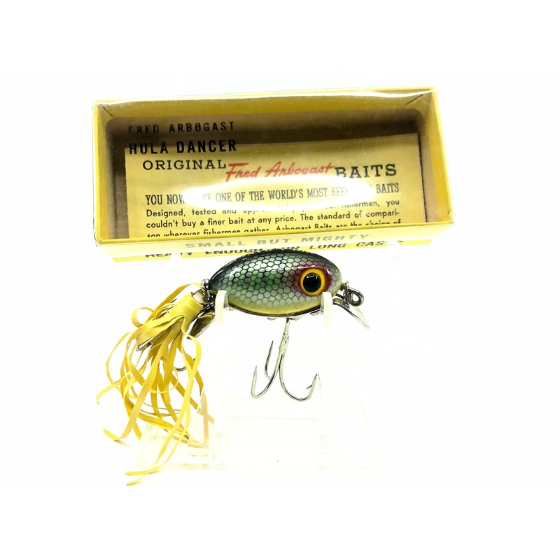 Arbogast Hula Dancer 800, P Perch w/Box. Early example of this bait and in one of the best conditions I've ever seen. About 2" long total. Lure is new in box. The box is in great condition as well. Rare to find these vintage lures with its skirt intact. Se