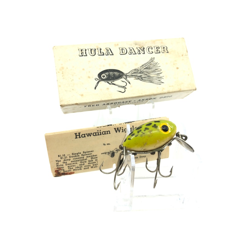 Arbogast Hula Dancer Frog Color with Box and Paper Insert. Nice vintage lure here. About 1 1/2″ long body. Nice shape on the lure. Box has wear but overall decent shape. Good combo here, see photos.
