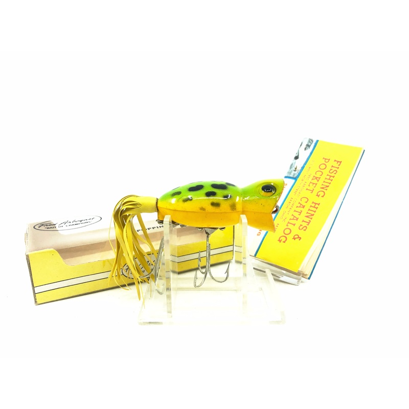 Arbogast Hula Popper 750, #07 Frog/Yellow Belly Color with Box. Great vintage bug-eyed model with a side stencil. Main body is about 2 1/4" long. Vintage popper is in new condition. Box has some minor wear as well. Fish or collect. See photos.See our entir