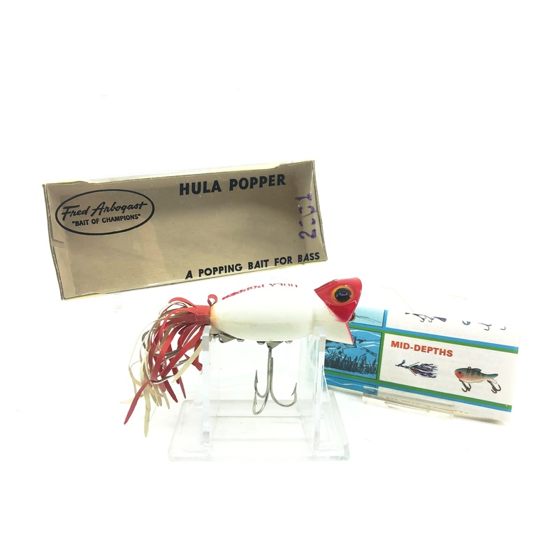 Arbogast Hula Popper 750, R Red/White Color with Box. Great vintage bug-eyed. Lure is about 3 1/2" long overall. Great bait here. Used with some minor wear but overall in good condition. Box has some minor wear as well. Fish or collect. See photos.See our