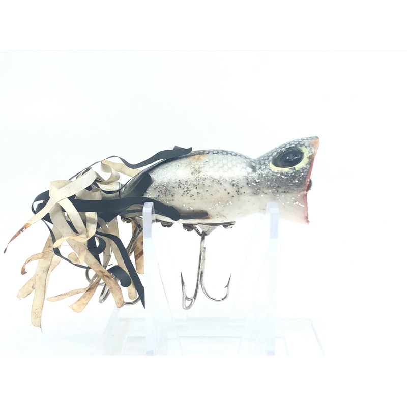 Arbogast Hula Popper Black and Sparkles. At about 2 1/2" long this larger hula popper is in good condition with very little wear but some stains. This iconic lure would look perfect in your collection or your tackle box. See photos.See all of ourArbogast l