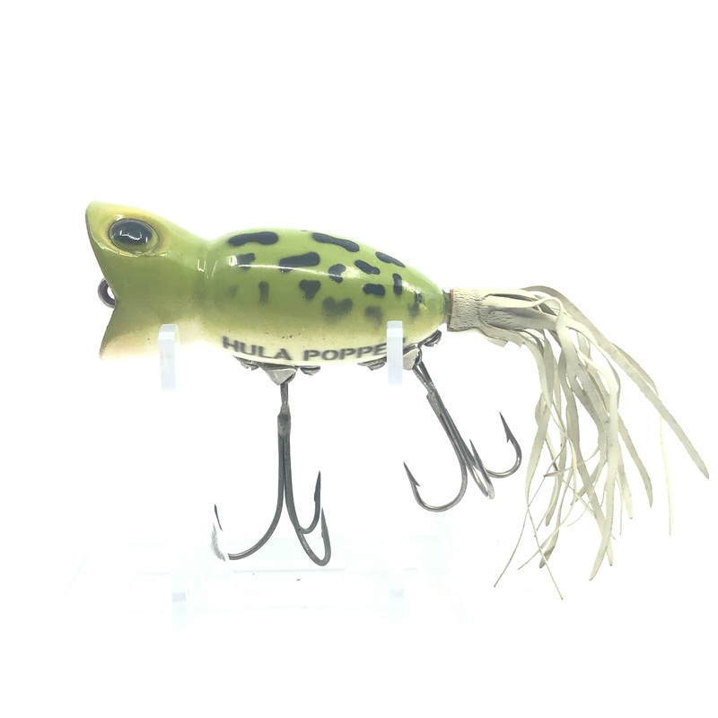 Arbogast Hula Popper Frog. At about 2 1/2″ long this iconic surface bait is in good condition with little wear to the paint however the tail is missing. See photos.