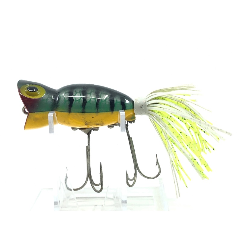 Arbogast Hula Popper Perch. This lure is in amazing condition. Some stains on the belly but a small price to pay for the overall condition of this lure. This is a larger Hula Popper at a length of 2 1/2" long. See photos.See all of ourArbogast lures here.