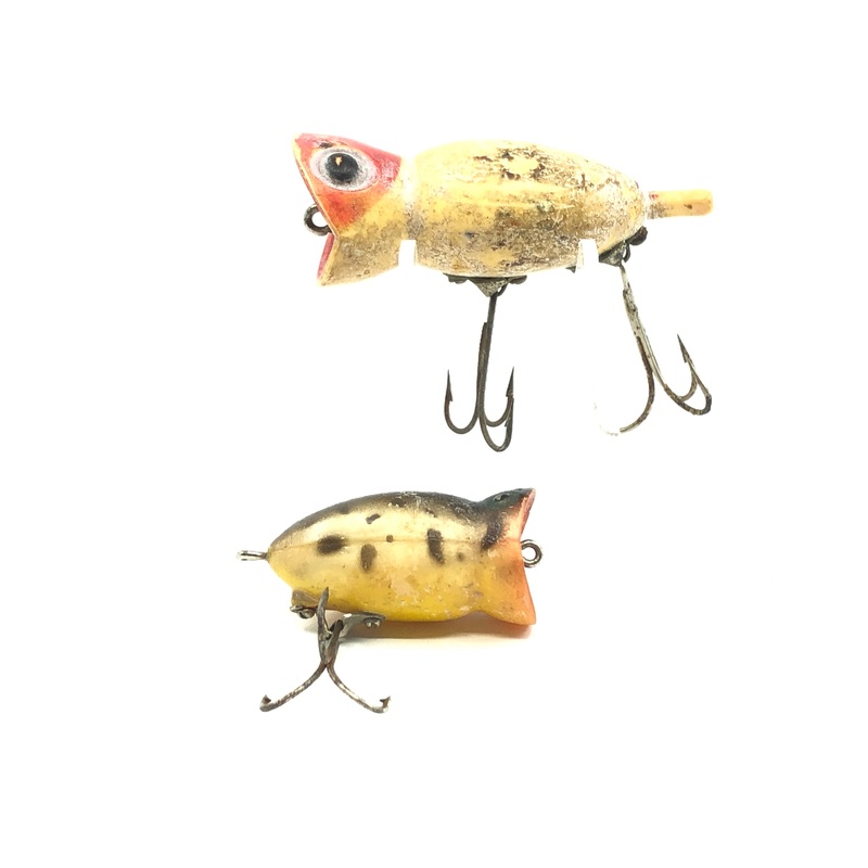 Arbogast Hula Popper Veteran Pack. Ranging 1 1/2″ to 2 1/2″ long these two warriors have seen plenty of action and show a lot of wear. Perfect for any collector or fishermen. See photos.