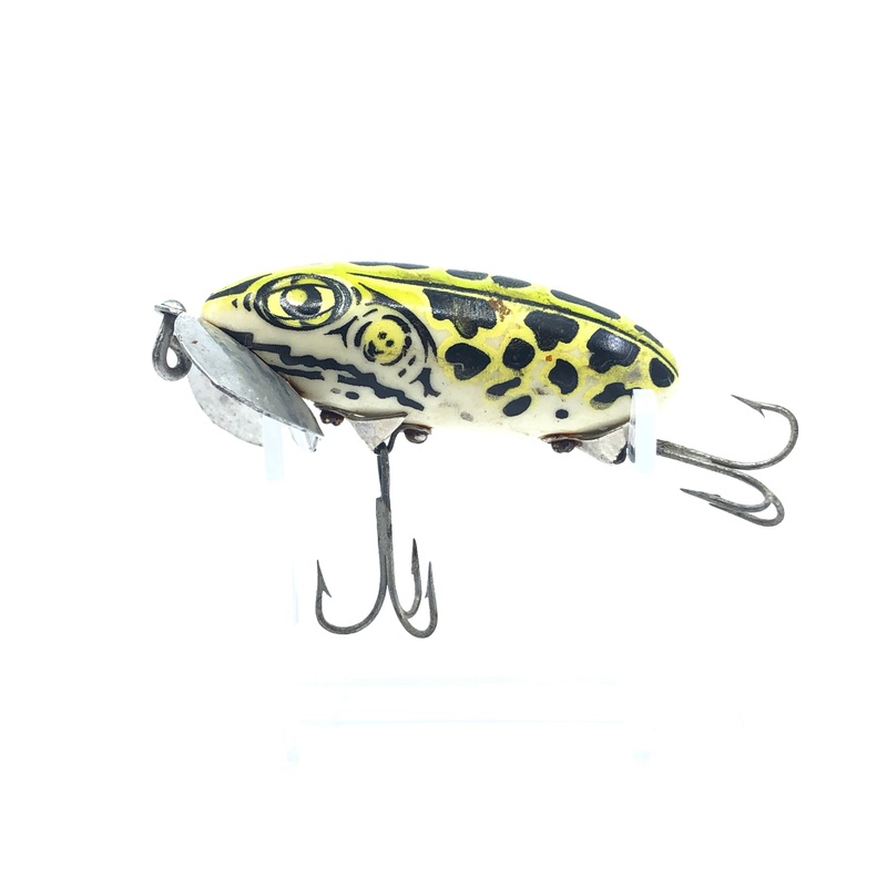 Arbogast Jitterbug Light Frog. At about 2 1/2″ long this iconic topwater bait is used but still in good condition. This jitterbug has been a popular lure for fisherman and collectors for years, find out why!