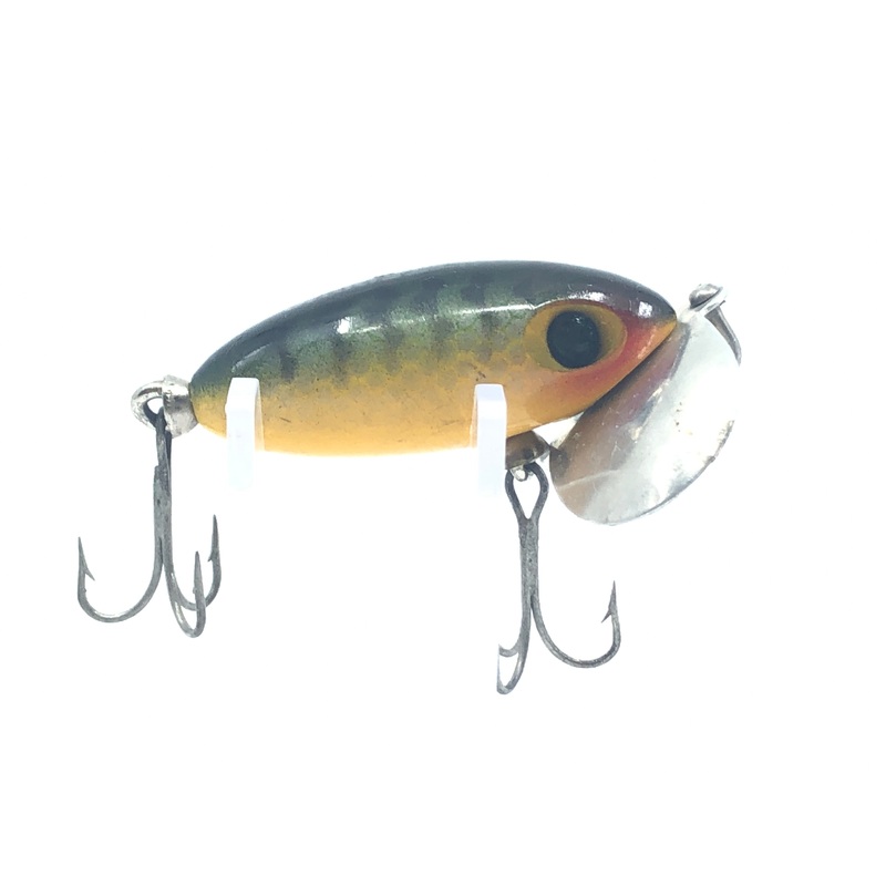 Arbogast Jitterbug Perch. At about 2″ this smaller jitterbug is in great condition with some signs of use but not too many. The realistic and reflective scales make the lure different from your average perch color.