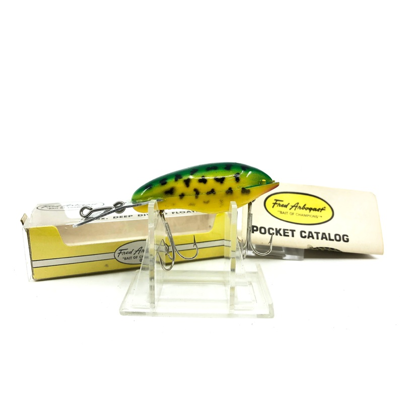 Arbogast Mud Bug, Frog/Yellow Belly Color with Box. Older Arbogast combo here with box catalog. Lure is about 3 1/2″ long including the lip. Box has some minor wear. Lure is new in box This lure would still look great in your collection or tackle box.