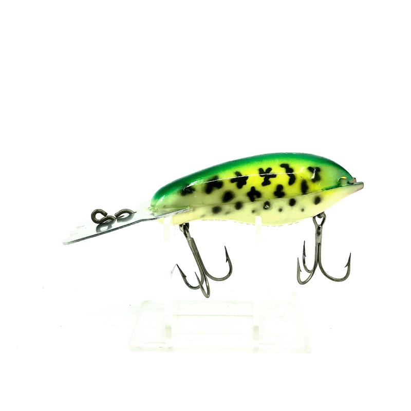 Arbogast Mud Bug Series 24, #6 Frog/White Belly Color. At about 4 1/4″ long including the lip and weighs 3/4oz.This bait is used but appears to have never been fished before and is in overall great condition.This lure would still look great in your collection or tackle box.