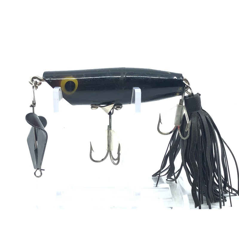 Arbogast Sputterbuzz Black. This lure is a harder to find Arbogast bait especially in this condition. Lure is in great condition with minor cuts and stains on the body but otherwise everything is intact. This is a larger Sputterbuzz at about 2 3/4" See pho