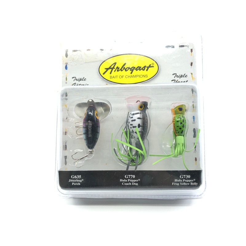 Arbogast Triple Threat. This pack comes in great condition and comes at a pric you can’t beat. The pack contains three topwater bass lures that have been catching fish for half a century. You get two legendary Arbogast Popper and one classic Jitterbug, in the most popular sizes and color patterns. It doesnt matter if youre fishing streams, lakes, rivers or ponds, these three lures will handle the job. Pack unopened.