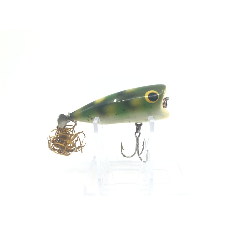 Bagley Pop’N B-2 Lure Frog Color. About 3″ long. Marked on belly. Used but in decent shape, part of the tail is on paint, will let you clean off, see photos.