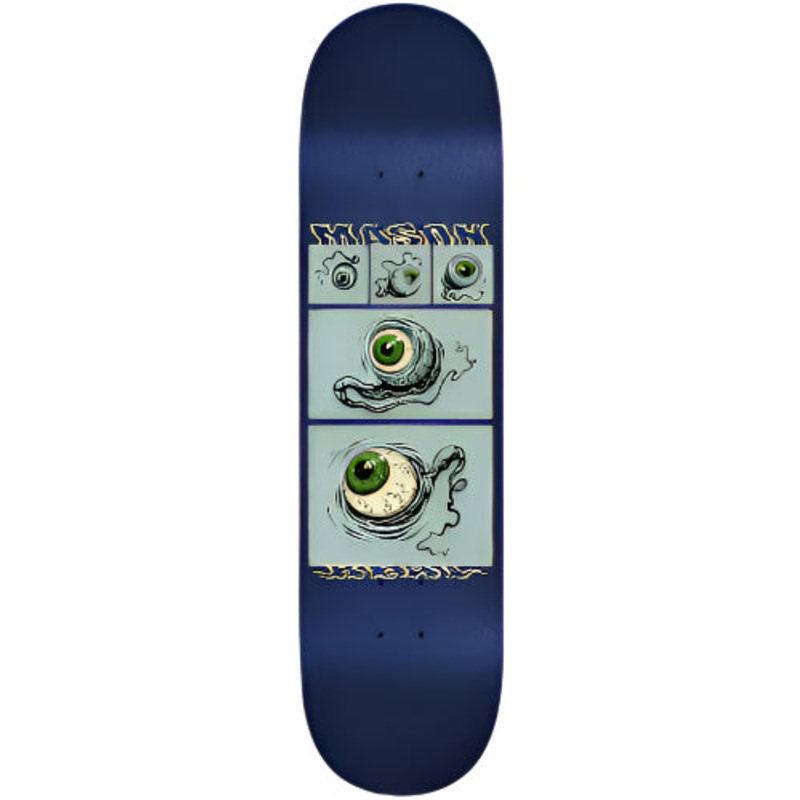 Mason Silva Pro ModelWidth: 8.5"Length: 31.8"Wheelbase: 14.25"7 ply maple constructionPacific blue glitterArt by Lou BarberioColor of the top ply will varyGriptapesold separately