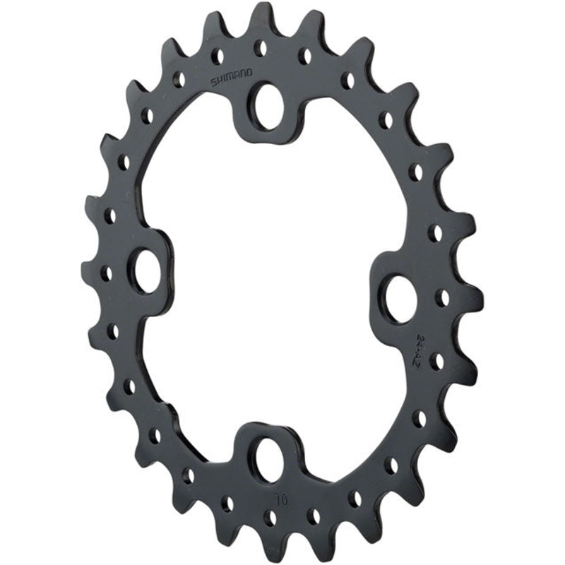 Deore M617 ChainringProduct Details:Compatible with 4-bolt, 104/64 pattern crank armsSpecifications:Chainring BCD: 64Color: BlackDefined Color: BlackDrivetrain Speeds: 10Material: AluminumRing Position/Type: InnerTooth Count: 24UPC: 689228646209MPN: Y1RP24