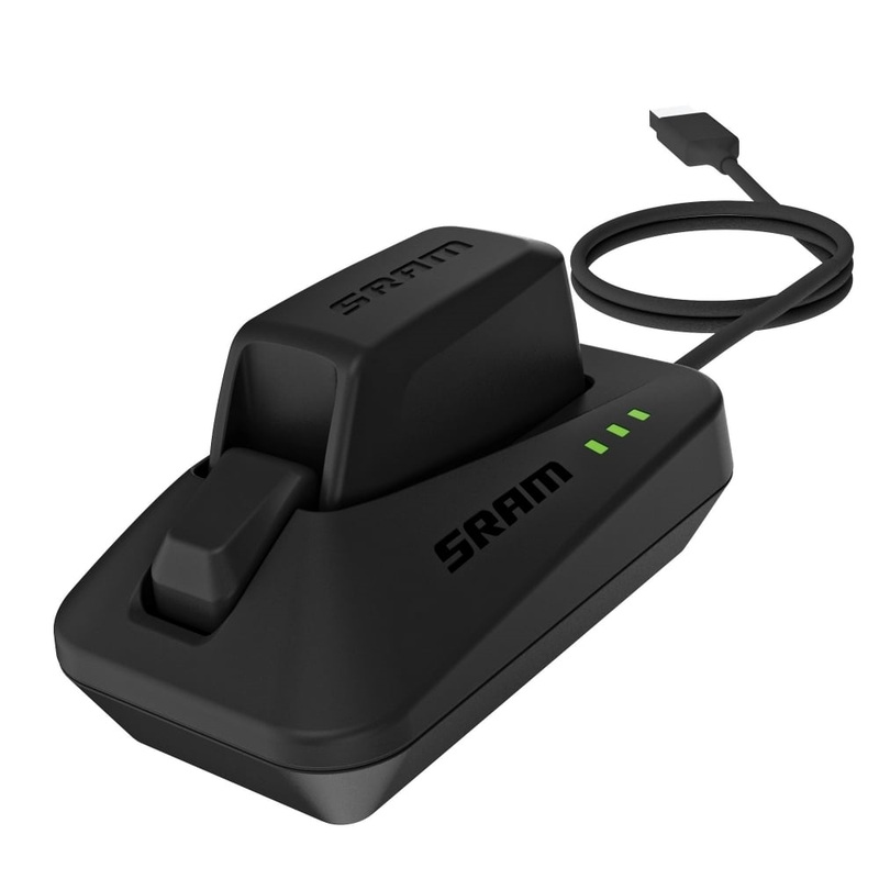 eTap batteries are literally a snap to remove and charge. Just flip the tool-free battery latch up and slide the battery up and out of the derailleur. Then snap the battery into the USB powered charger and connect the charger to any USB power source or A/C USB adaptor. A full charge takes just 45 minutes to complete.