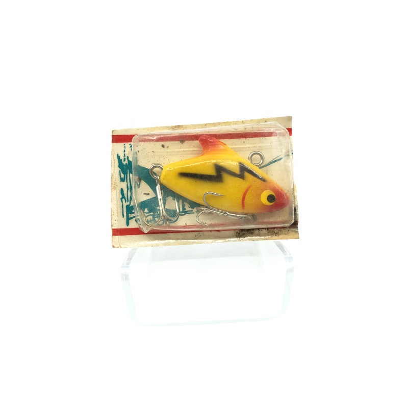 Super Sonic Type Lure New on Card Japan Yellow with Lightning Bolt. About 2″ long. Lure is new inside card. Card is cut from a bigger card at some point and has some wear. Not sure who made this, maybe Herter’s. Marked Japan on the bottom. Great lure to fish or collect. See photos.