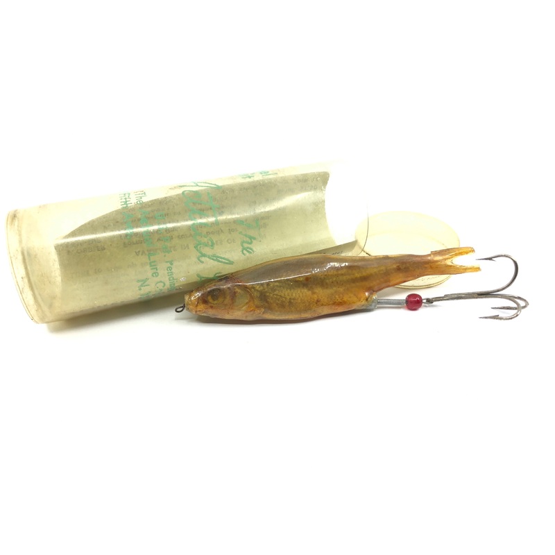 The Actual Lure with Tube 3 1/2″.Yes, that is a real minnow. Sealed in plastic with a hook. Quite the conversation piece for your collection or take fishing. Tube has some wear, lure in decent shape. See photos.