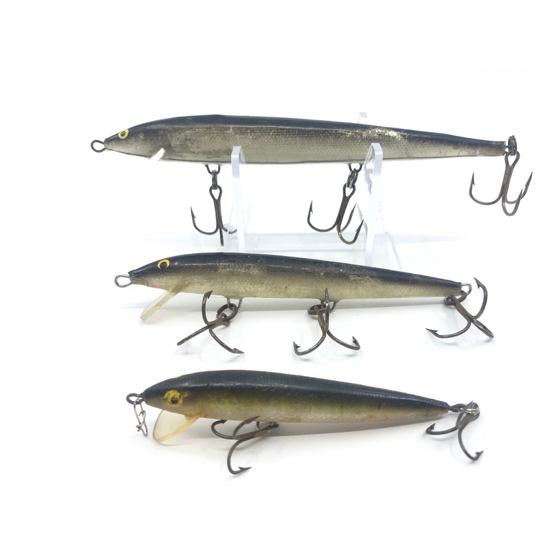 Three Rapala Warrior Minnows. Three sizes of minnows for whatever your fishing needs are. Lures are in variable condition with a decent amount of wear on all of them. Great for fishing or collection.See all ofour Rapala lures for sale here.