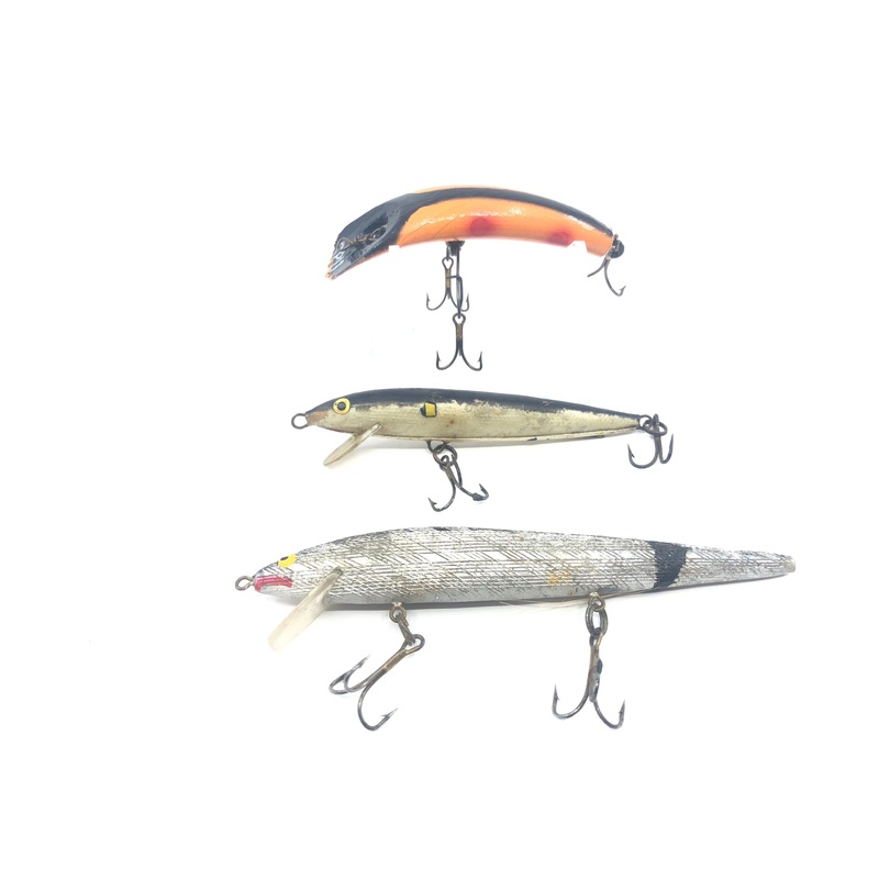 Three Warrior Baits. Lures are in varying condition. The Helin Flatfish is a SPU but has a snapped off lip tip. The others are unmarked. Great for fishing or collection.