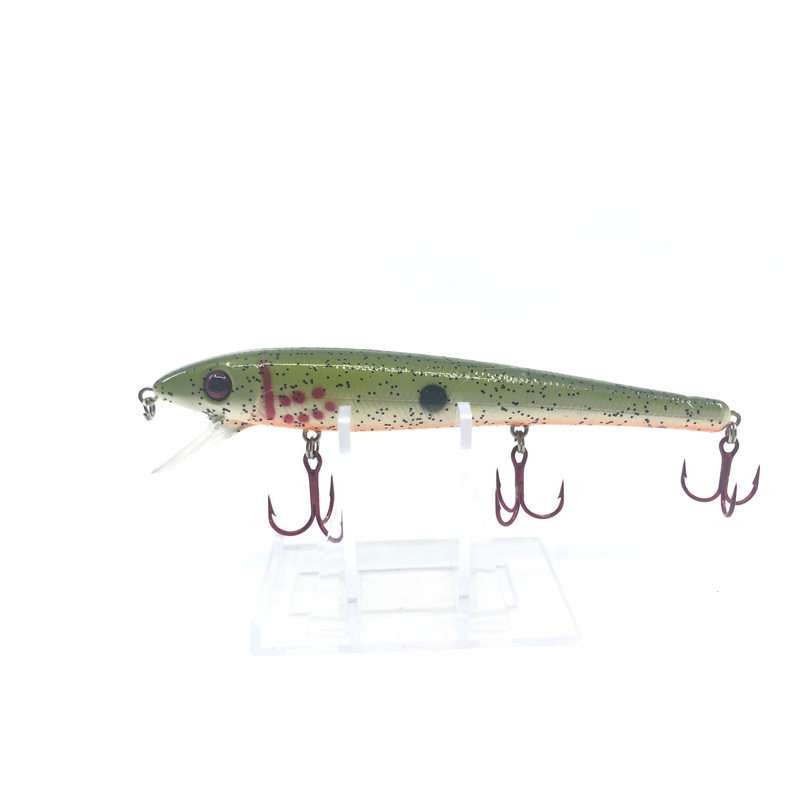 Trout Colored Crankbait. About 5″ long and in very good condition. For fishing or collection. Has an S marked on the bottom. Bleeding Trout type pattern.