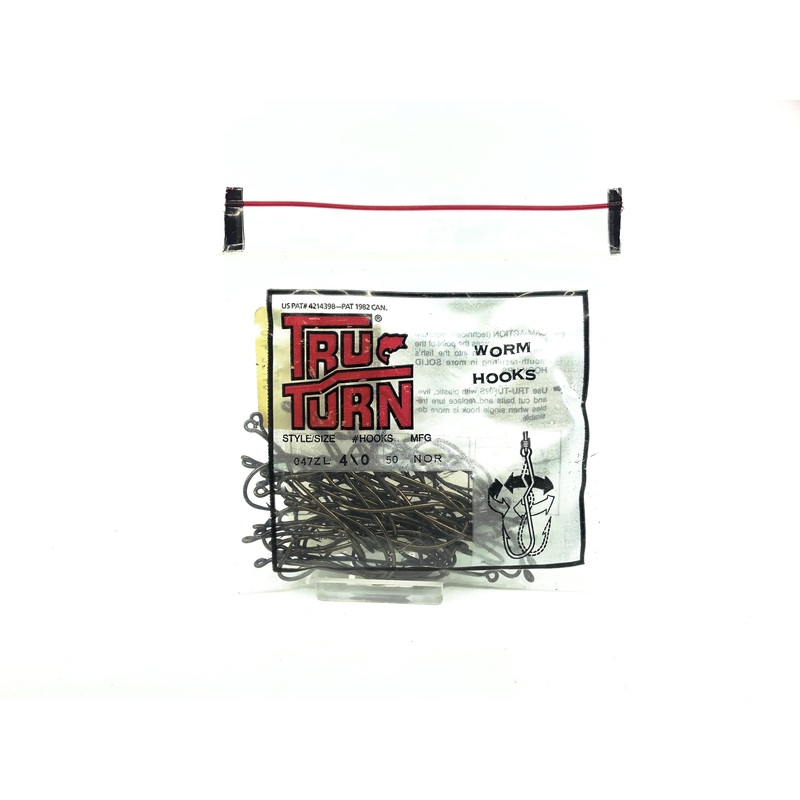 Tru Turn Worm Hooks 4/0 - 50 Count. Vintage old stock here. Uniquely designed hooks that forces the point of the hook to turn into the fish's mouth, resulting in solid hook ups. One package has a small hole in it from a hook poking through. Fish this deal,