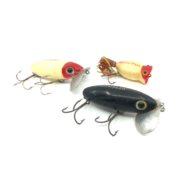 Two Arbogast Jitterbugs and One Hula Popper. Nice lot here. All used with some wear. Black Jitterbug is the nicest. All have some wear and waxing. See photos. Take fishing or put in a display.See all of ourArbogast lures here.