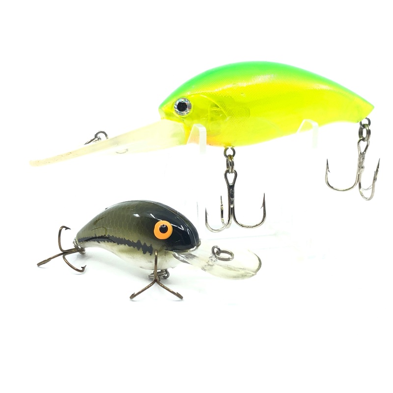 Two Professionally Made Unmarked Crank baits. Ranging from 5" (Top) to 3" (Bottom) these two lures are both in great shape with nothing major to note. These two lures may be unmarked but they're well made lures with great coloring. See photos.