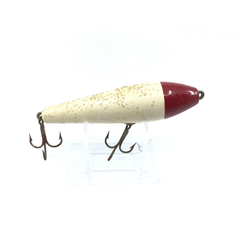 Unknown Red and White Antique Lure. About 3 3/4″ long. Don’t know who made this one but it’s pretty decent. Plastic lure. Note the bevel at the bottom of the head. Flitter on the top. Used but appears in decent shape, see photos. Add to your collection today.