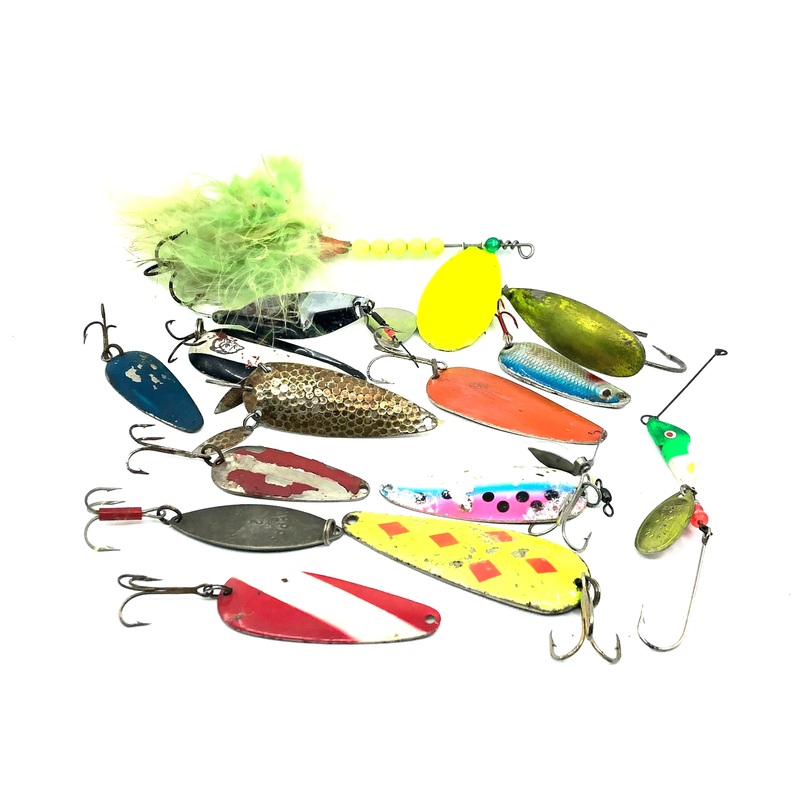 Used Spoon/Spinner Pack. This pack includes 14 metal spoons and spinners. Including an Erie Dearie, Johnsons Silver minnow, a Mepps spoon and more. All baits are used with varying degree of wear. See photos. Fish or collect. This is over 8oz of metal baits here. While they are used, certainly a nice pile for fishing!