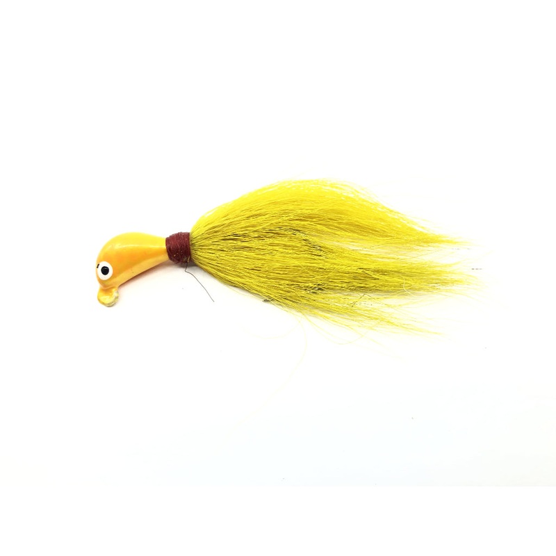 Vibrant Yellow Buck Tail Jig. Lure is roughly 3 1/2" long including tail. Lure is in great condition with minimal wear and has likely never been used due to the eye-hole being covered in paint. Would look good in a tacklebox or collection.