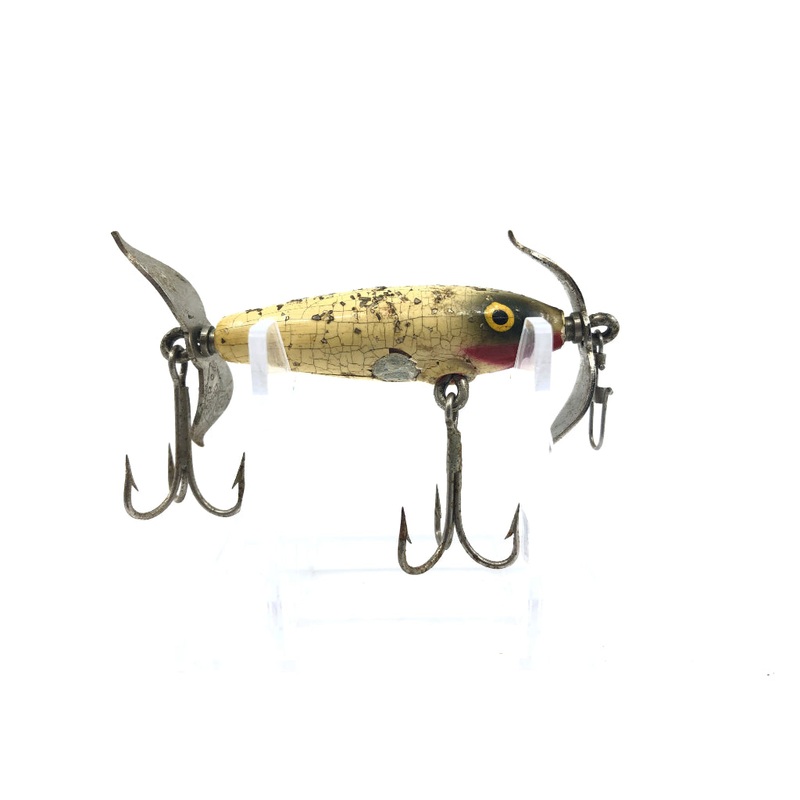Vintage Eger Baits Baby Dillnger White Sparkles Grey Back. At about 2 1/4″ long this lure is used but in good condition aside from the cracks in the paint. This is an amazing vintage Florida made bait. See photos.