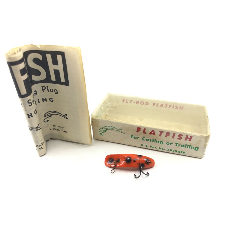 Vintage Helin Flatfish F3 OR Orange with Box. This smaller flatfish is about 1 1/4″ long and is in amazing condition condition with a small crack on it from aging. The matching box is also in very good condition. These smaller fly-rod flatfish are in high demand, get it while you can. See photos.