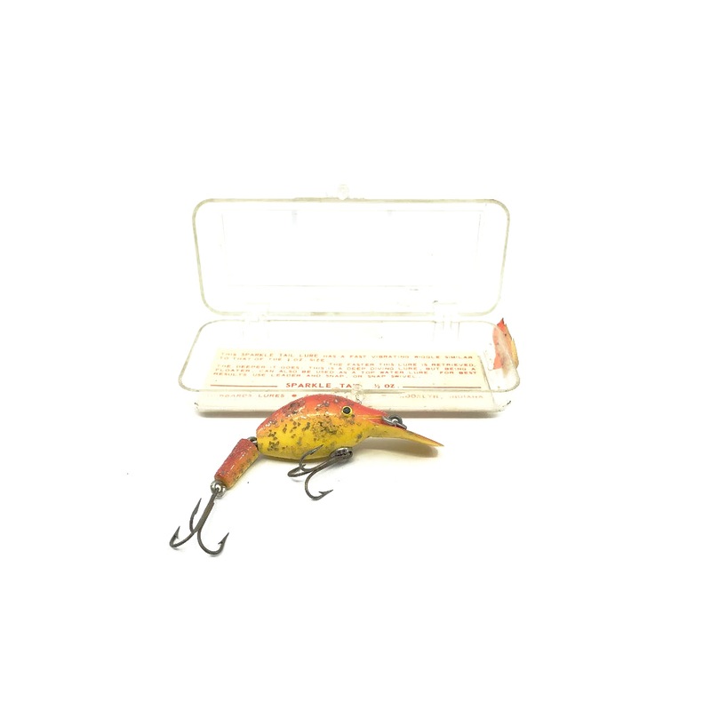 Vintage Hubbard Sparkle Tail Yellow and Red with Box. Great lure here. Awesome for walleye and bass. Great to collect. About 3" long. Vintage but in good shape aside from some waxing. See photos.See all ofour Sparkle Tail lures for sale here.