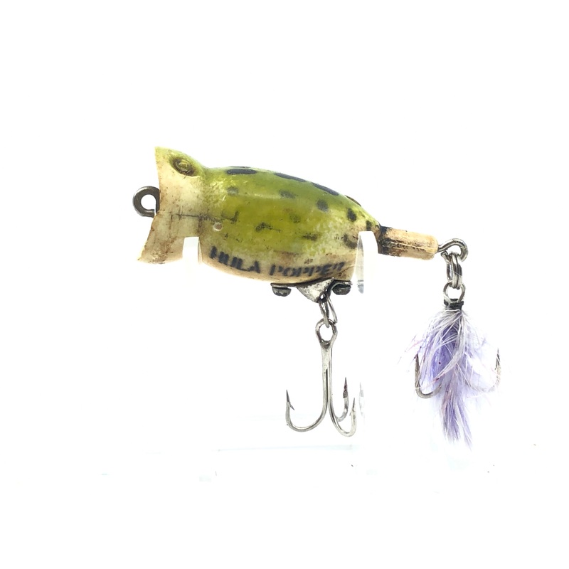 Vintage Hula Popper Frog and Purple Tail. At about 2" long this popular top water bait is in ok condition with plenty of battle scars. The Hula Popper has a long history of outlandish fishing tales and thousands of casts. This would look great in your coll