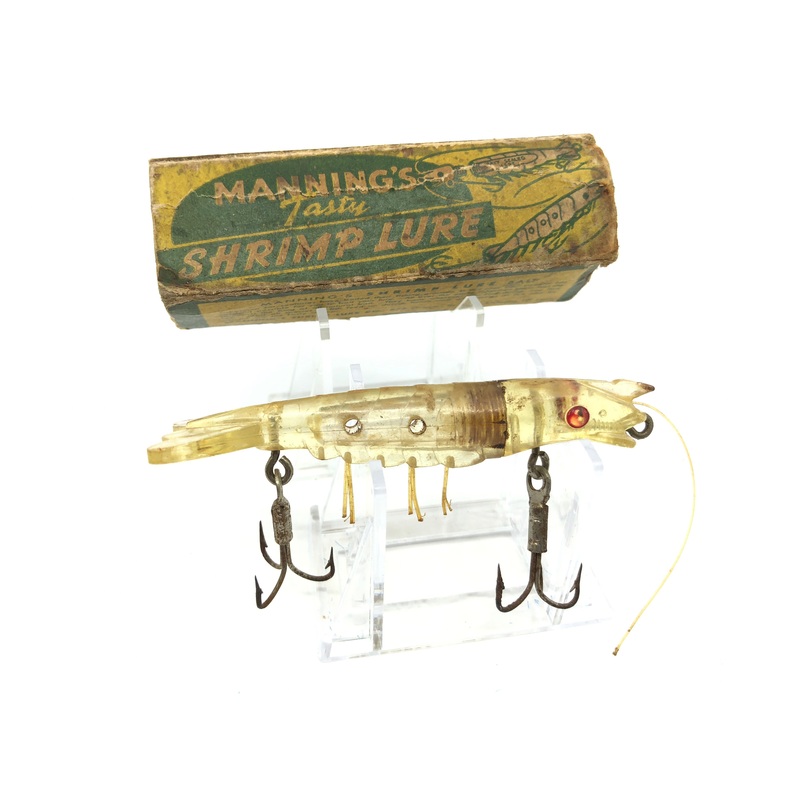 Vintage Mannings Tasty Shrimp Lure with Box. About 4" long.Louisiana Bait from around 1954. Was originally intended to be filled with scent. Clear color. Used but good condition, see photos. Box is in rough shape and is missing ends. Tough to find box in a