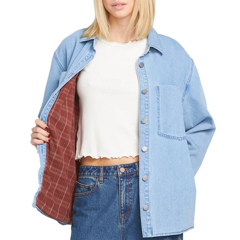 This Volcom Women's Chill Trap Shacket Jacket is an oversized denim wonder that features a plaid flannel lining to keep you cozy, while large chest pockets provide ample storage for your everyday essentials, and a dropped back yoke adds a touch of edge. Sl