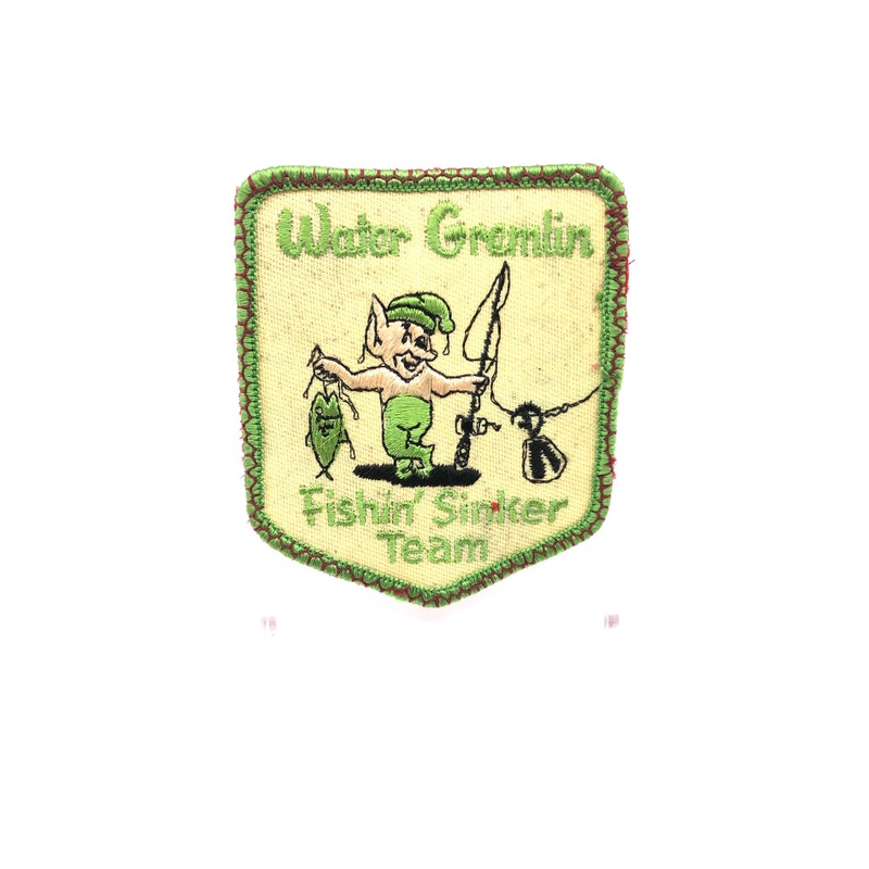 Water Gremlin Fishin’ Sinker Team Patch. About 3″ x 2 3/4″. Used with some minor wear but overall good condition. See photos.These look awesome with your fishing lure display or put on your fishing gear.Add to your collection today!