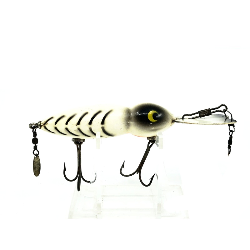 Whopper Stopper Hellbender, White Shore Color. About 4 1/4" long including the lip. Used vintage lure with some wear and and minor marks but still in overall good condition. These lures are collectible and highly sought after by fisherman. Killer on bass!