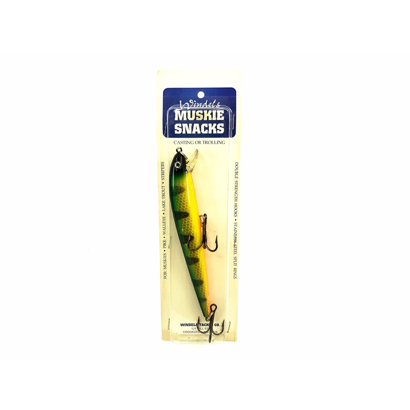 Windel's Muskie Snack's Shallow Runner 6", Perch Color on Card. Uncommon Muskie lure here. Lure is about 6 3/4" long in total. Lure is new on card and the card is in great condition. Fish or collect, see photos.Tough one to find, especially on the card.See