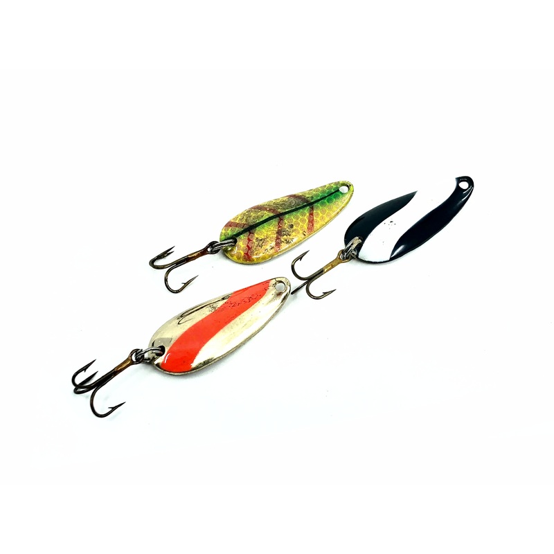 Wonderlure Spoon Three Pack. This pack includes 3, 0.25oz 1 3/4″ long Wonderlure Spoons. All in three great colors. Each lure is used with some minor wear but still in good condition and ready to fish. Fresh from a vintage tackle box.