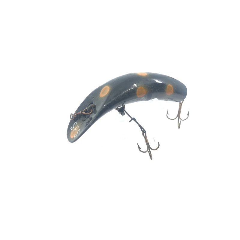 Wooden Helin Flatfish SPS Black With Orange Spots. This lure is about 2 3/4″ long. In great shape. For fishing or collection. Tough to find these SPS lures.