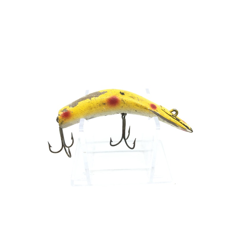 Wooden Kautzky Lazy Ike 3 Yellow Spots Color Warrior. About 3″ long. Used with significant wear as shown. See photos. This warrior has seen some life. Proudly display, repaint or put this one back in the boat where it belongs. These old wooden ones from the 1950’s know how to catch fish. This one didn’t get this way by sitting on a shelf. See how many fish it can put back in your boat.