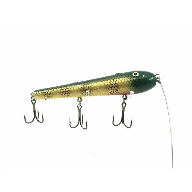 Wooden Musky Topwater Bait, Pike Color. Great wooden bait from an unknown maker. Lure is about 6 1/4″ long. Used with some minor wear but in overall good condition. Fish or collect. See photos.